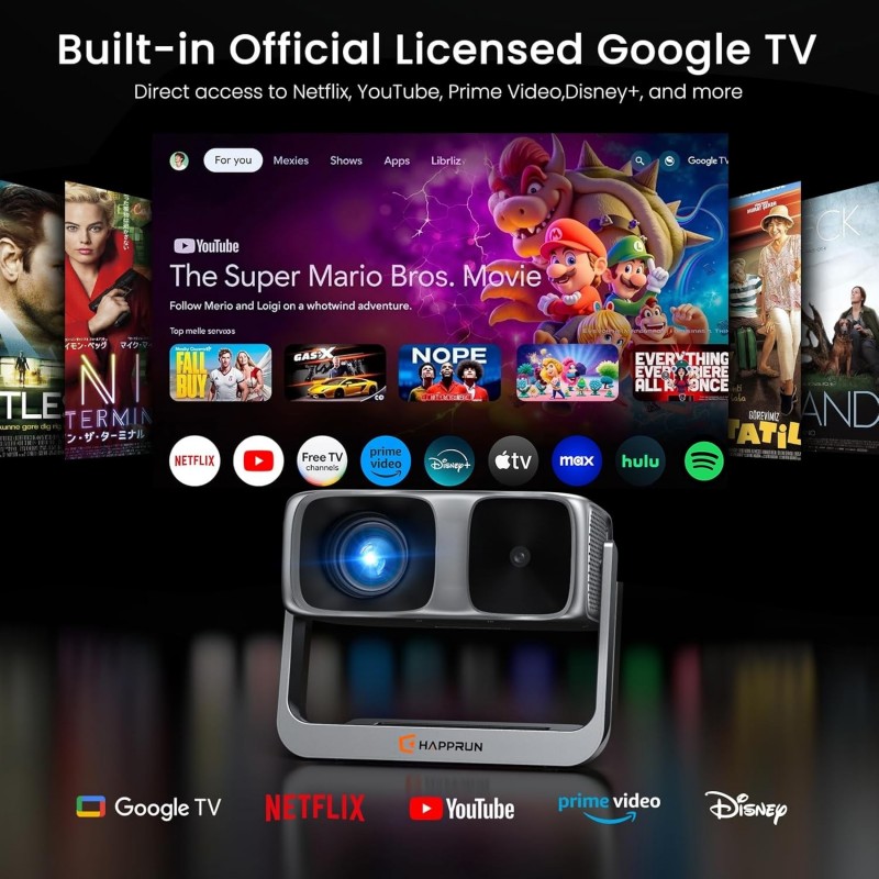Il proiettore smart è dotato di sistema Google TV integrato, che consente l’accesso diretto a oltre 1.000 applicazioni, tra cui Netflix, Prime Video, YouTube e Hulu. Plug and play per una visione dei film semplice e immediata.